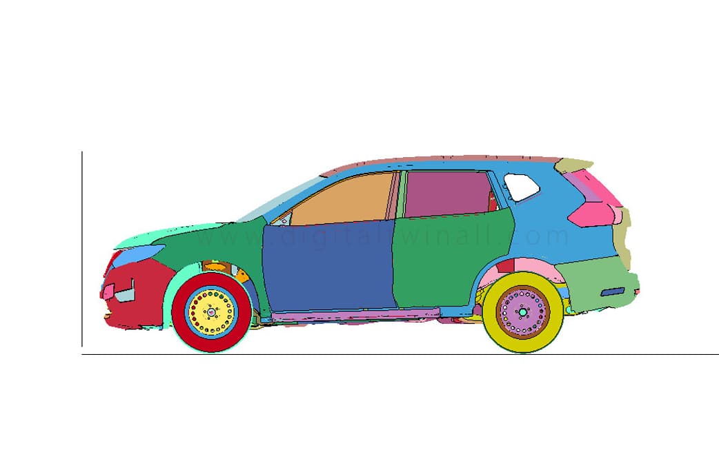 - 试验车辆 100%重叠正面冲击固定刚性壁障,碰撞速度为 50 km/h;该 FE 模型使用 Hypermesh 和LS-DYNA 开发。