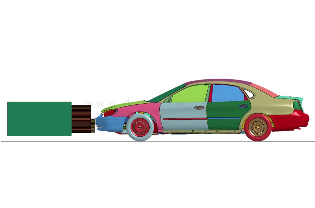 - 模拟车辆与移动渐进变形壁障(简称“MPDB”)台车分别以50+1km/h 的碰撞速度进行正面 40%重叠偏置对撞。碰撞车辆与渐进变形壁障碰撞重叠宽度应在 40%车宽的范围内。 试验车辆在前排驾驶员放置一个 Hybrid III 型 50 百分位男性假人,用以测量前排人员受伤害情况;该 FE 模型使用 Hypermesh 和LS-DYNA 开发,集成安全带的动态碰撞模拟座椅有限元模型。