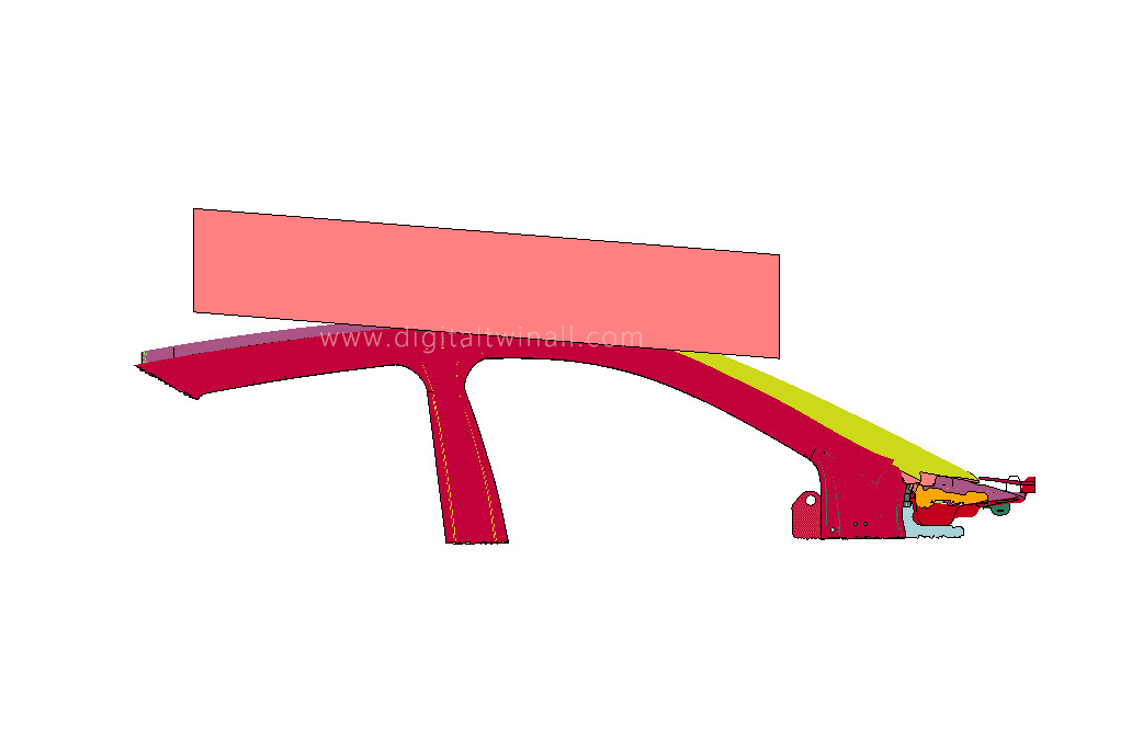 - 车辆在汽车翻滚试验,由于乘员舱的压溃变形会入侵乘员的生存空间,导致乘员受到伤害,因此制定FMVSS 216。在车辆下方车底进行刚性固定支撑,保证车轮不与地面相接触;对压板施力,测出运动距离和压力值大小;试验时压板与车辆Y轴夹角为25°保持不变,顶部接触点距压板最前端254mm,试验过程不放置假人,IIHS-NCAP中车顶静态压溃试验的评测方法:根据车顶压溃变形127mm时压力与车重的比值(SWR)来评估车顶抗静压能力;该 FE 模型使用 Hypermesh 和LS-DYNA 开发。